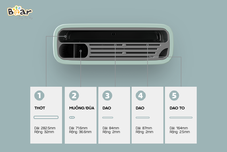 Máy sấy tiệt trùng Bear XDQ-B01Q1 ngoài sấy khô, khử khuẩn còn dùng để làm giá đỡ bảo quản, phù hợp với các dụng cụ bếp như: thớt, dao, đũa, dĩa, muỗng…