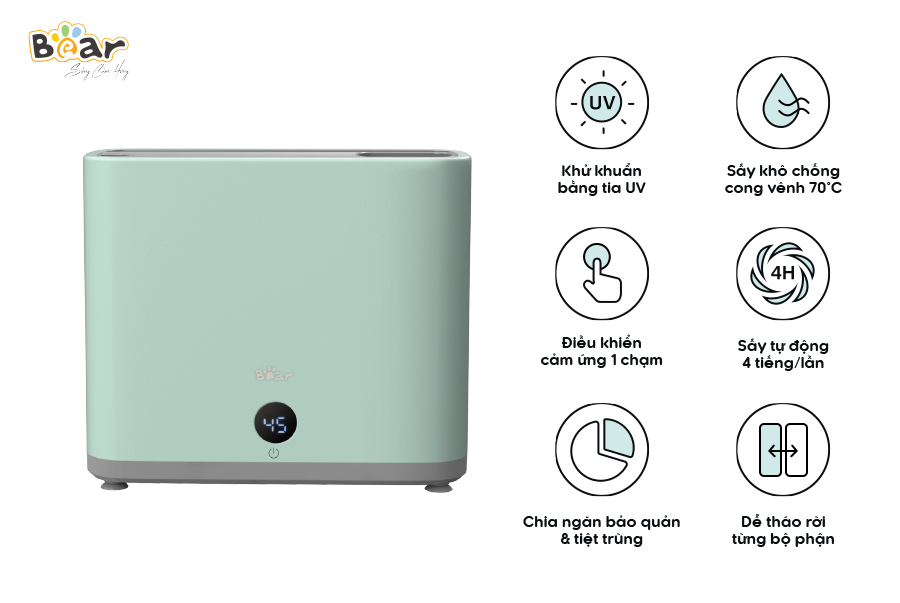 Với luồng khí tuần hoàn 360° và công nghệ kiểm soát nhiệt an toàn PTC nóng đều, máy sấy đũa, dao, thớt Bear kết hợp chế độ khử khuẩn tia UV tiêu diệt và hạn chế vi khuẩn sinh sôi trong môi trường nhiệt độ thấp.