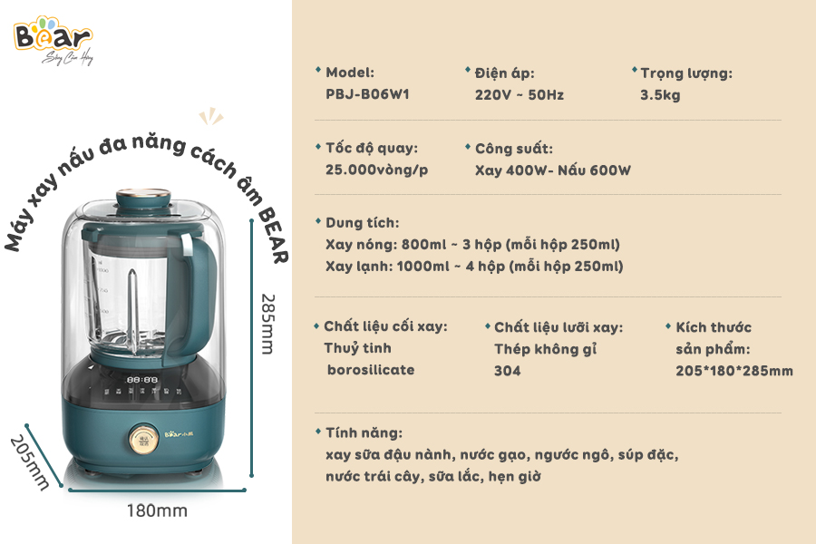Máy xay nấu đa năng cách âm PBJ – B06W1 với 6 chức năng tích hợp trong 1 sản phẩm giúp bạn vừa xay sữa, các món sinh tố dinh dưỡng cho cả gia đình, nấu các món cháo, súp ăn dặm ngon miệng cho bé một cách dễ dàng. Được thiết kế gọn nhẹ, bảng điều khiển lập trình sẵn dễ sử dụng, cối xay thủy tinh chịu nhiệt cao, chống bỏng, máy xay đảm bảo an toàn cho người dùng. Cùng Bear trải nghiệm sản phẩm máy xay mới này nhé!