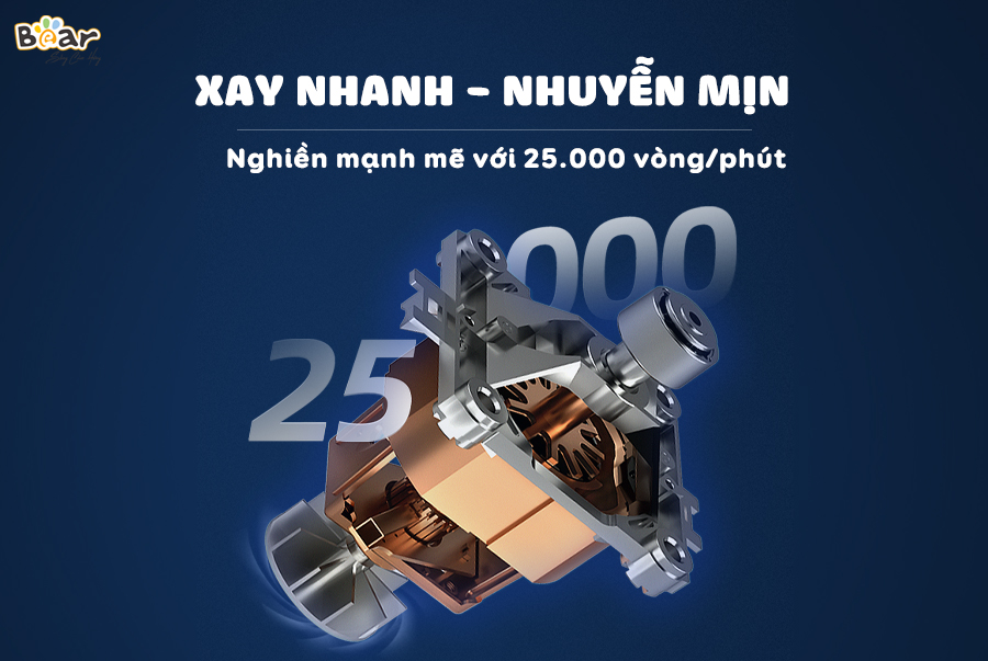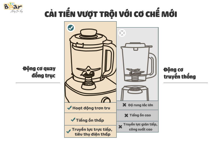 Dung tích lớn, nhiều chức năng cũng thể đổi lại sự thoải mái, thư giãn mà chiếc máy Bear mang lại. Trở dậy sau một giấc ngủ đêm dài, hoặc là về nhà với cảm giác mệt mỏi sau nhiều giờ làm việc, liệu bạn có muốn nghe âm thanh ồn ào từ chiếc máy xay khi vừa vào bếp không? Bear thấu hiểu điều đó và cho bạn giải pháp tuyệt vời trong sản phẩm này. Sự kết hợp của hộp chống ồn và hệ thống động cơ đồng trục giúp máy cách âm và giảm rung đến mức tối đa giúp bạn thoải mái nấu nướng ngay bên cạnh mà không bị làm phiền.