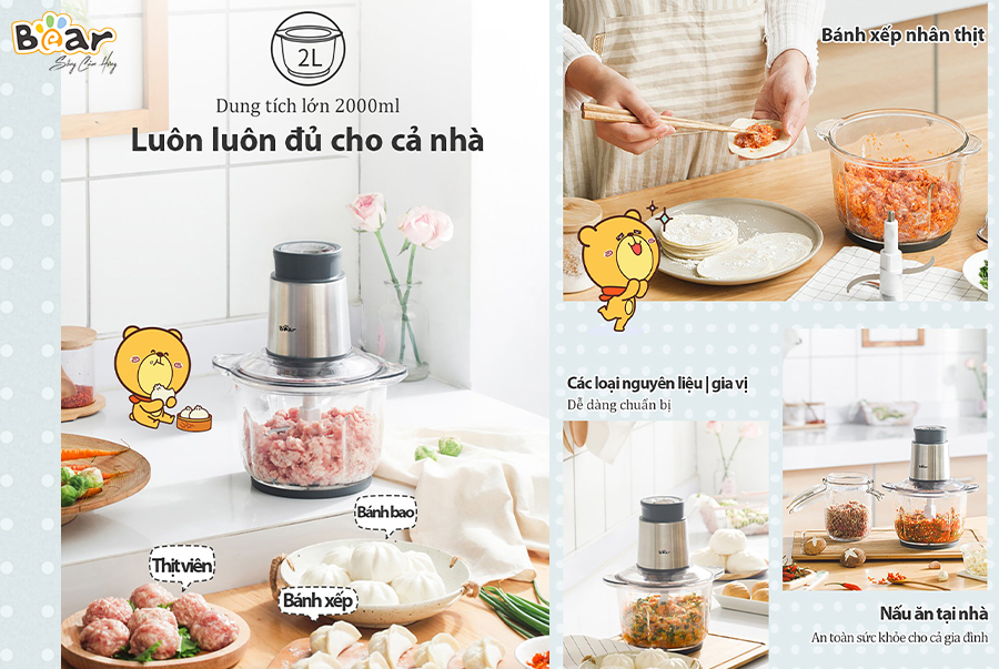 Máy xay đa năng 2L Bear QSJ-B03Y7 sở hữu thiết kế đơn giản với dung tích lớn cho phép xay khối lượng thực phẩm lớn, phù hợp với mọi gia đình. Công suất xay lên đến 300W máy xay thực phẩm Bear giúp bạn xay thịt, cá, rau củ,… và nhiều loại thực phẩm khác nhanh gọn.
